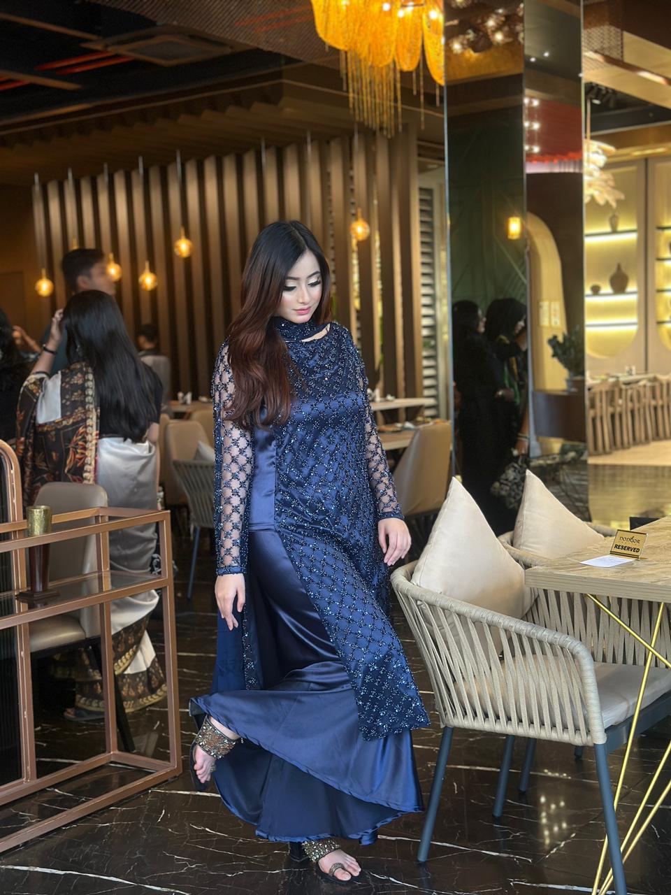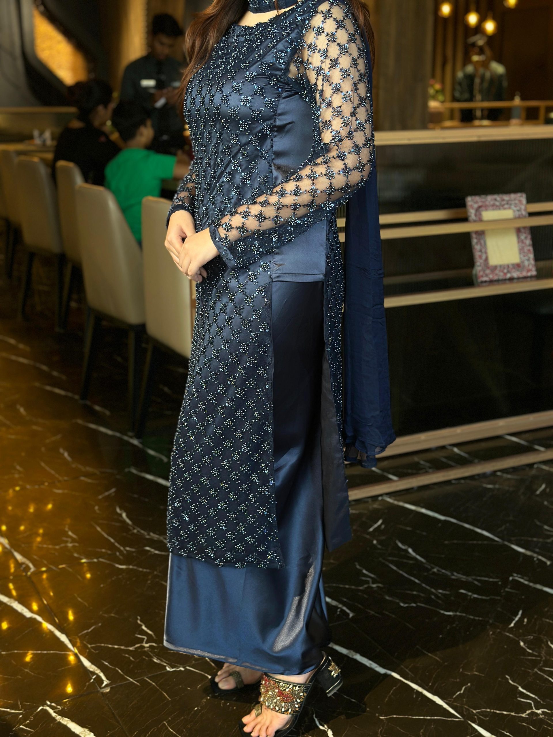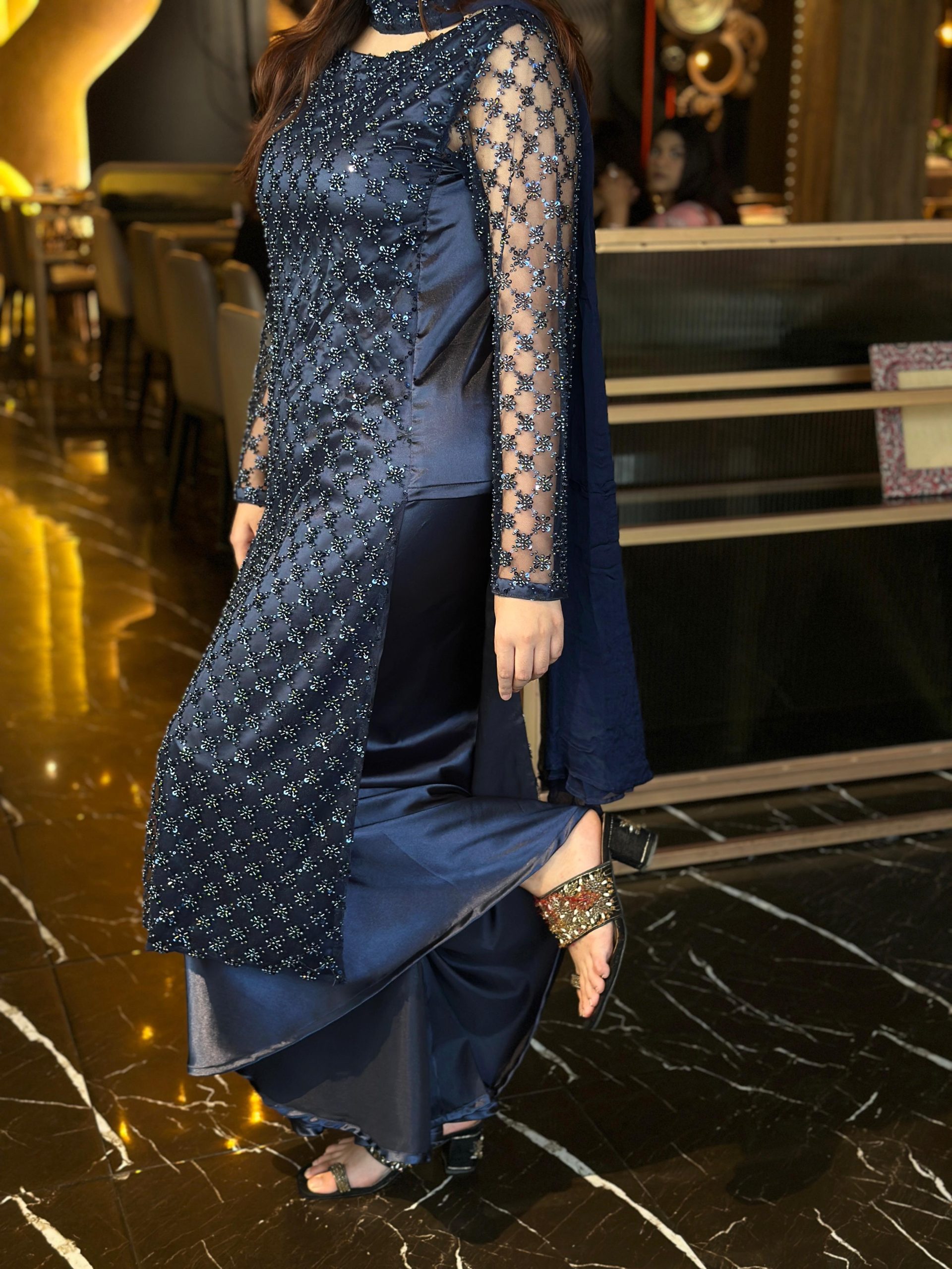 Experience the epitome of royal elegance with our Navy Blue Sequin Masterpiece. This long-design ensemble is meticulously crafted for the woman who desires a sophisticated, trend-setting look for this Eid. Featuring an intricate play of light and shadow through its all-over sequin work, this dress ensures you remain the centre of attention at every festive gathering.