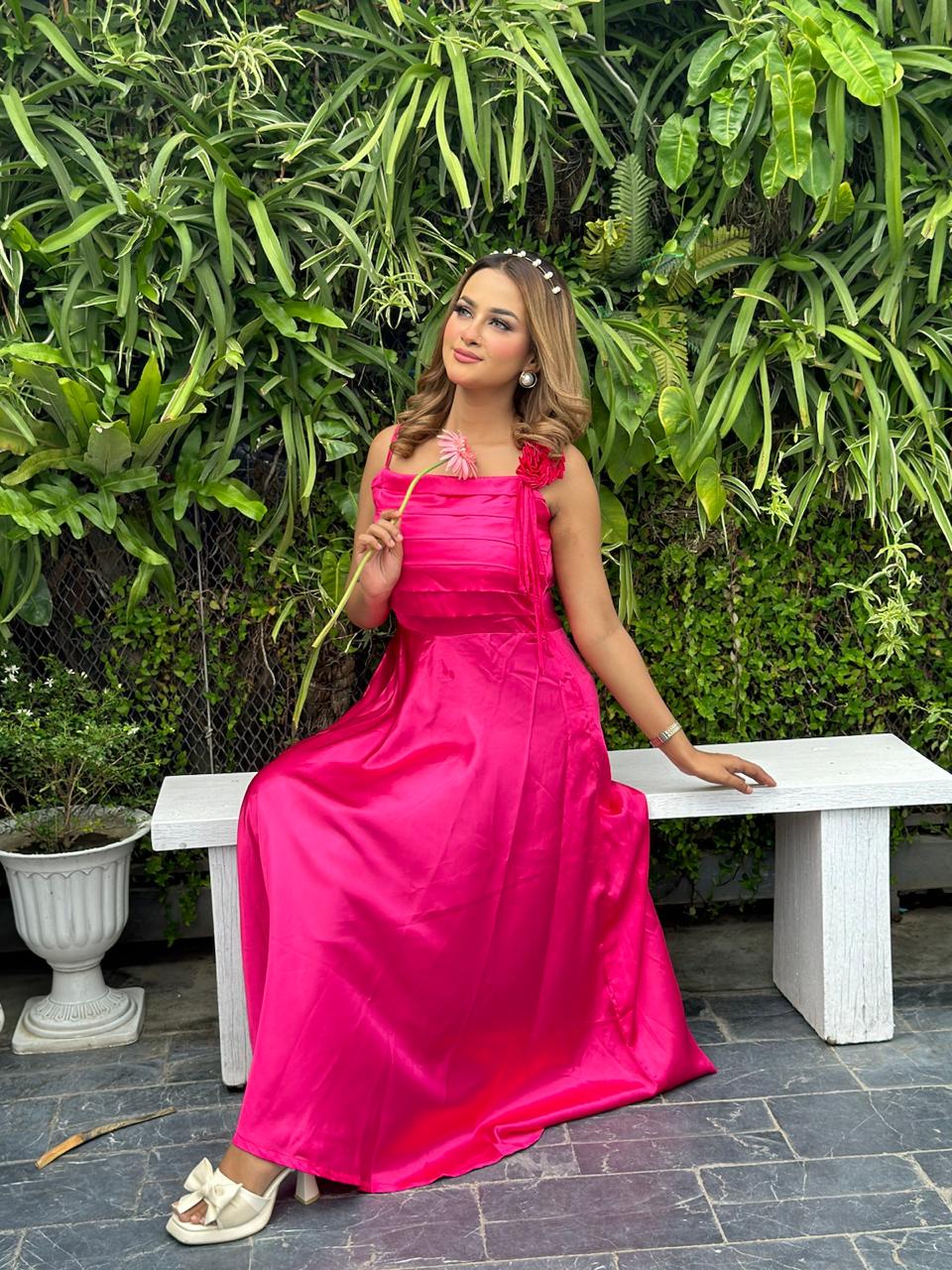 Fuchsia Rose Pleated Satin Maxi Dress