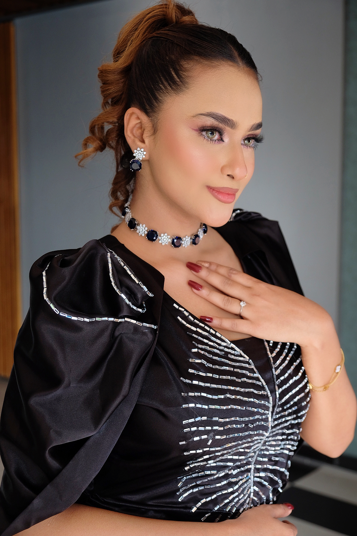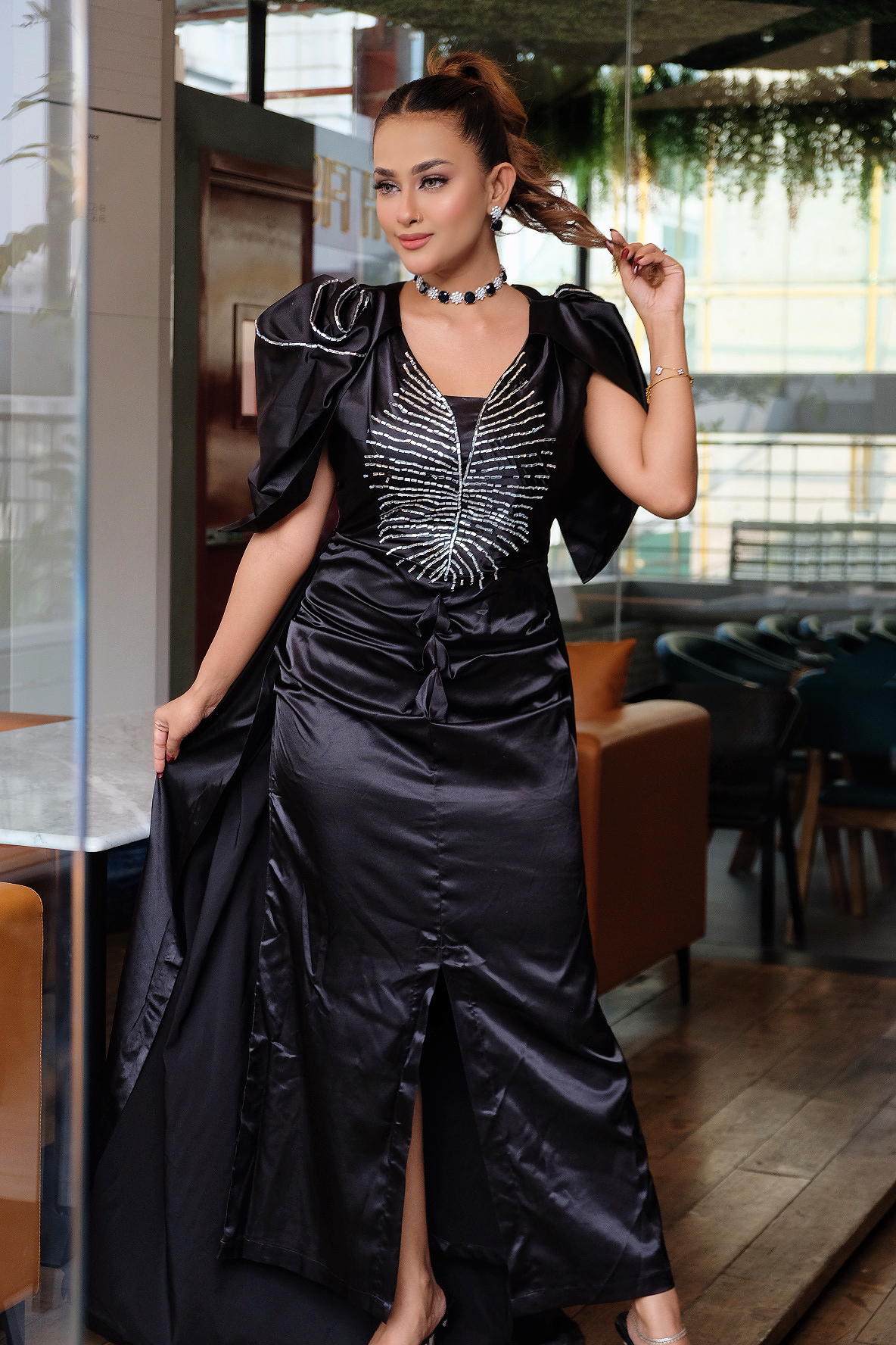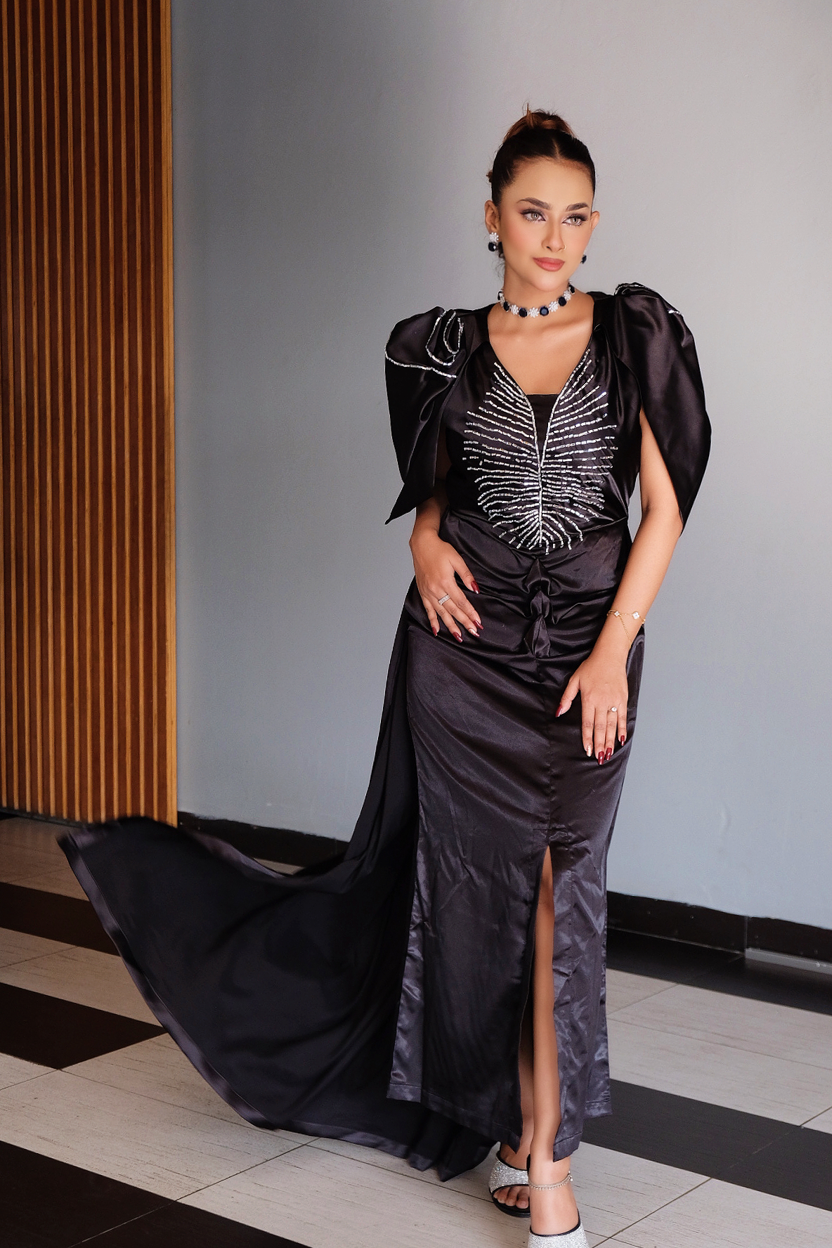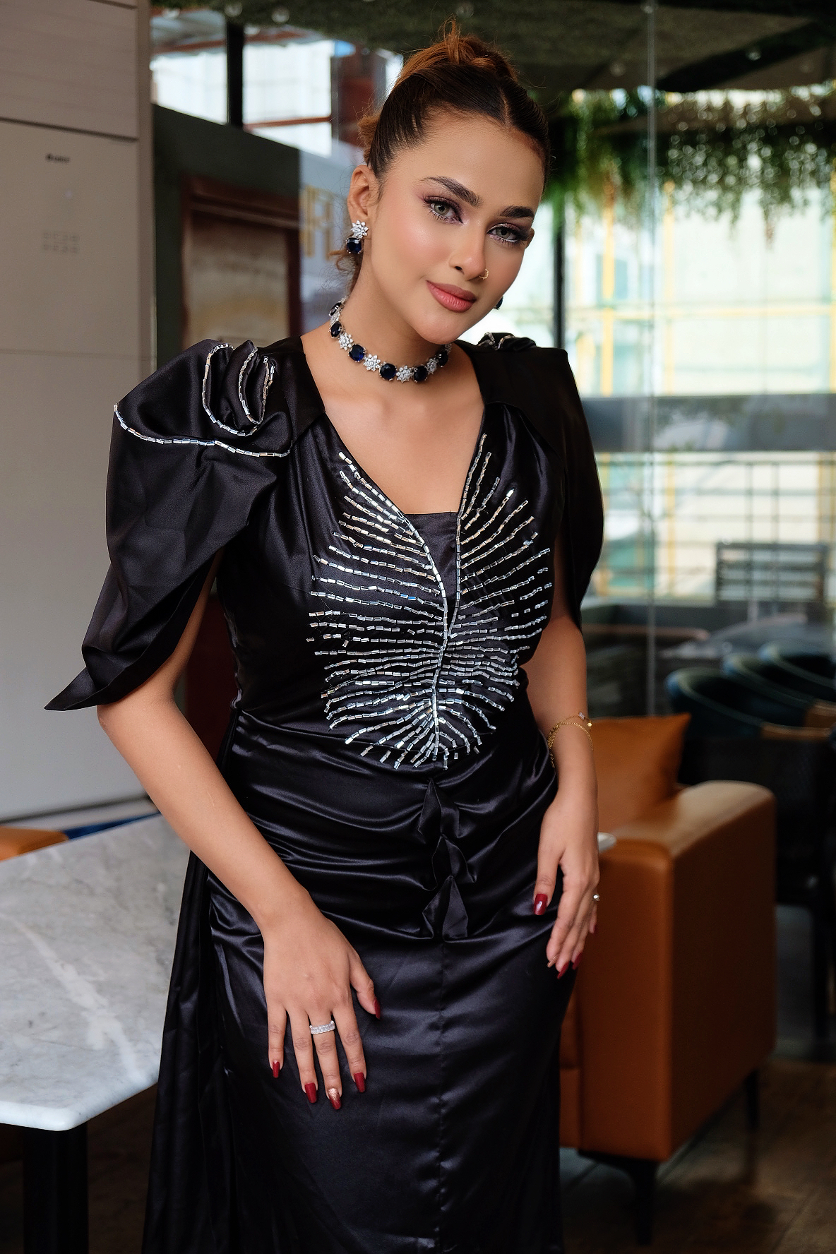 This exquisite ‘Starlight’ Ball Gown from Kazi Fashion World is designed for the woman who commands attention. Crafted from luxurious, deep black Bunon Silk, this dress perfectly blends classic elegance with striking, contemporary details. It is the definitive choice for galas, red carpet events, upscale parties, and other formal occasions where a powerful style statement is essential.
