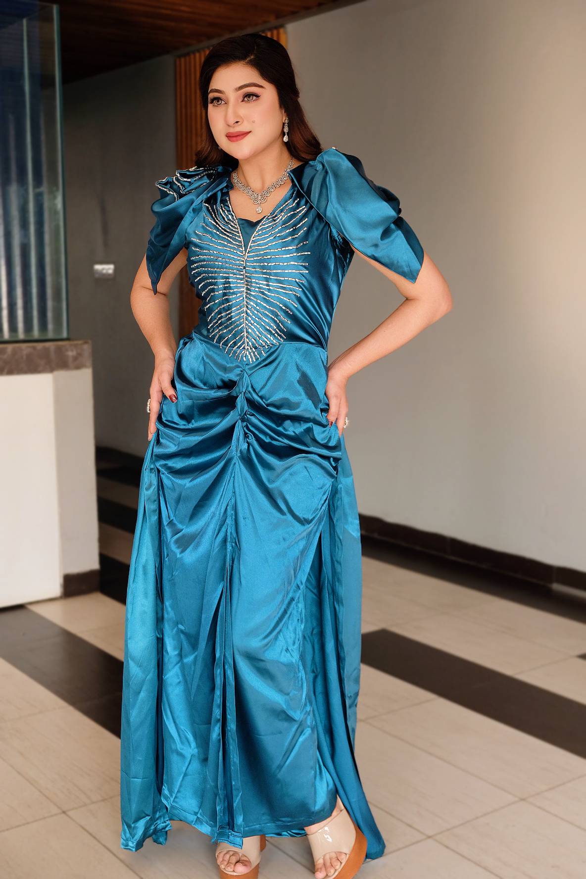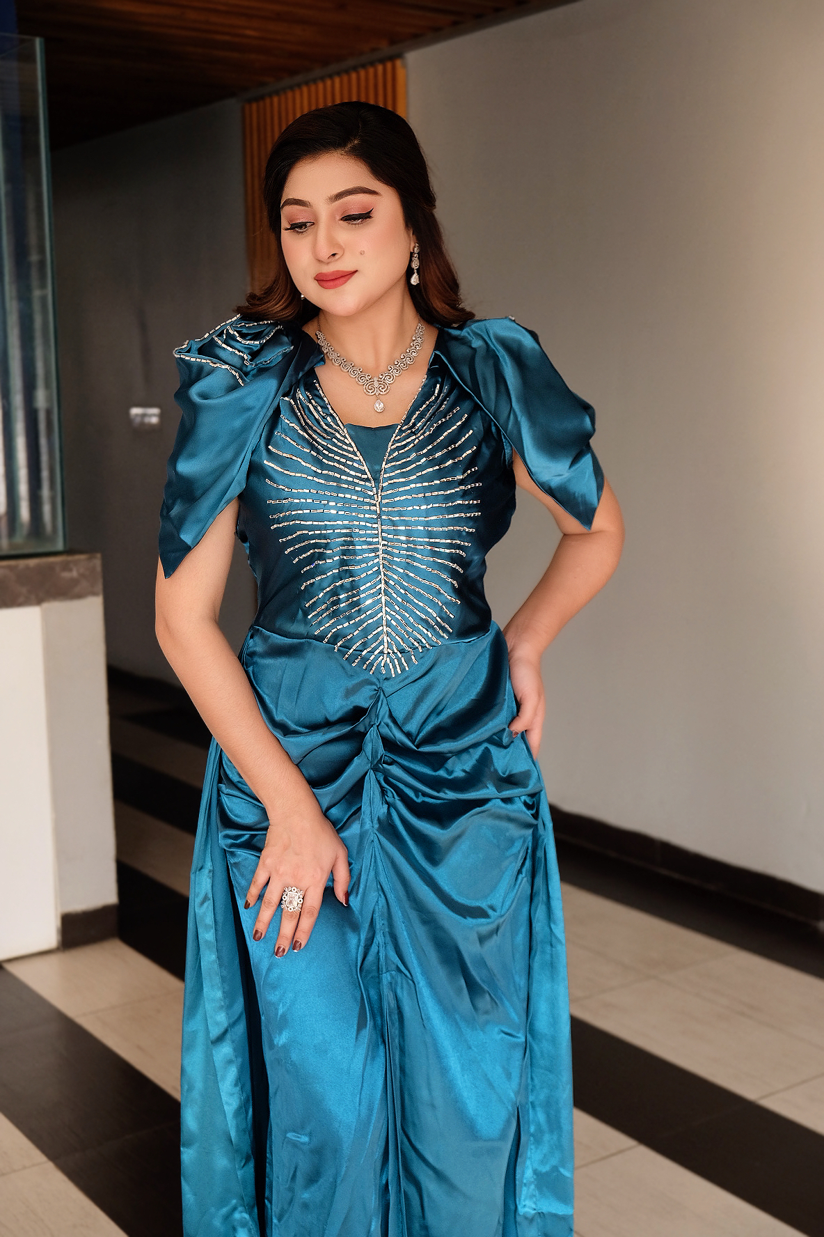 Make a grand entrance with the ‘Teal Radiance’ Starburst Gown from Kazi Fashion World. This breathtaking piece is crafted from a premium, high-sheen satin that captures the depth of the ocean in its rich teal hue. Featuring a dramatic architectural silhouette and luminous hand-applied beadwork, this gown is designed for red-carpet events, galas, and high-fashion celebrations.